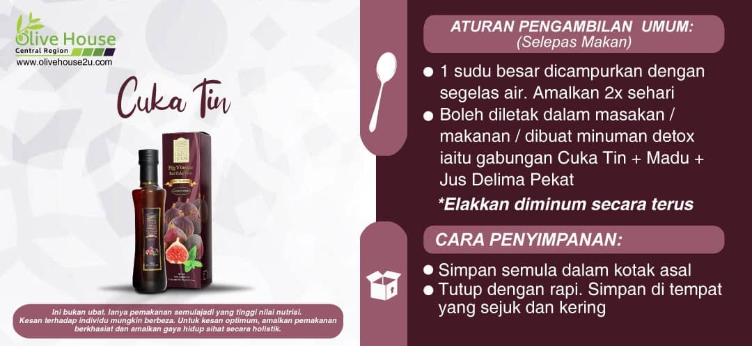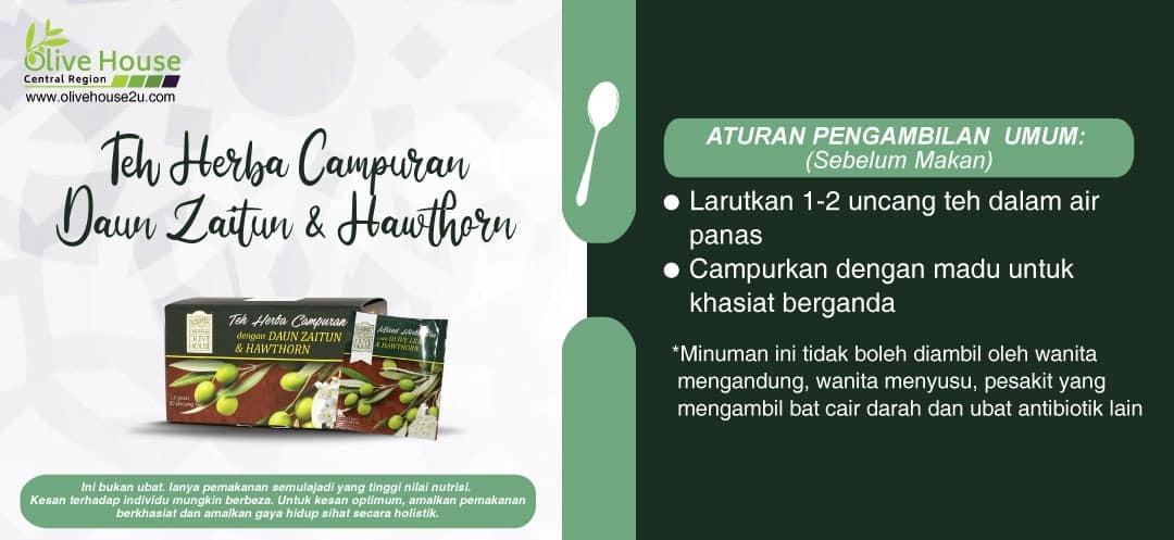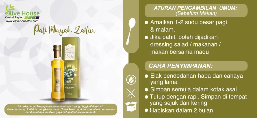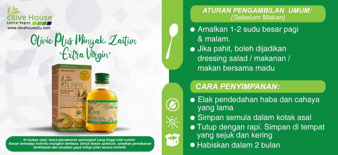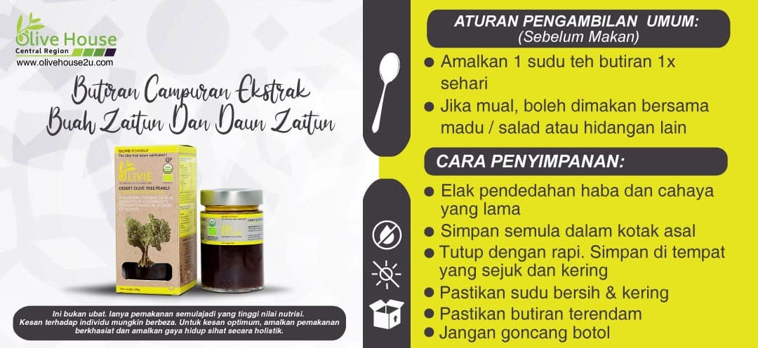 Produk Olive House bukanlah ubat. Ianya adalah pemakanan semulajadi yang tinggi nilai nutrisi dan khasiat. Kesan terhadap individu mungkin berbeza. Untuk medapatkan kesan optimum, amalkan secara konsisten mengikut aturan serta amalkan gaya hidup sihat secara holistik.